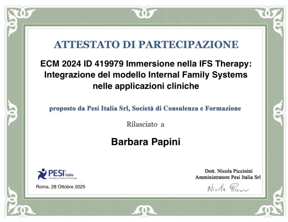 Ho scelto successivamente di approfondire con il percorso in "Psicoterapia" presso "l'Istituto Gestalt-Analitico- Centro Studi Psicosomatica" di Roma.